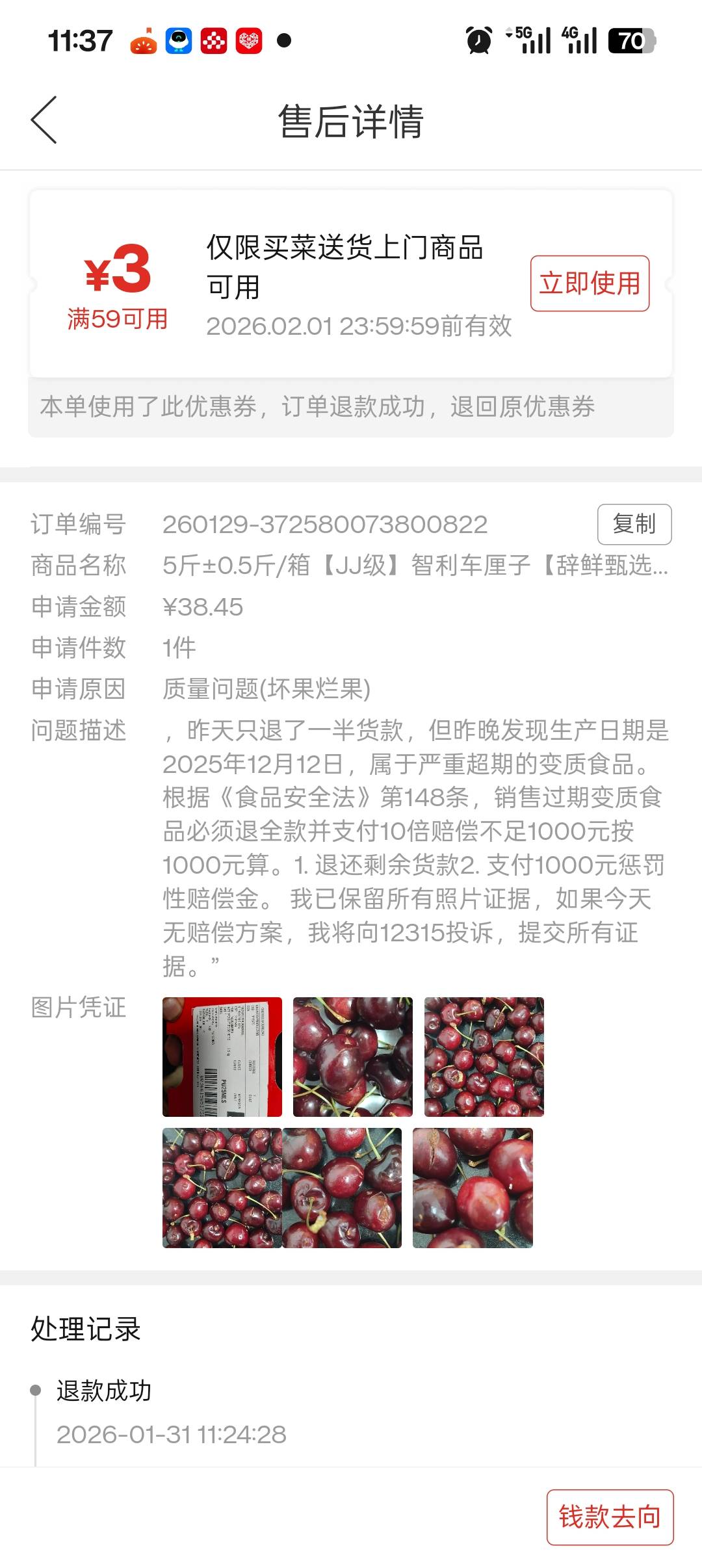 您好,我要爆料多多买菜售卖过期变质车厘子。1月29号下单(订单号260129-200781381960822),实付76.9元,1月30号10点顺丰送到浦东。当天气温4-5℃,快递仅放1小时40分,拆箱就见大量烂果(果梗蔫、表皮坑、果肉软)。晚上发现包装日期是去年12月12号,超期49天!我要求全额退款+1000元赔偿,但平台分两次退我货款,未赔1000元我有完整证据链,希望你们曝光,帮消费者维权
