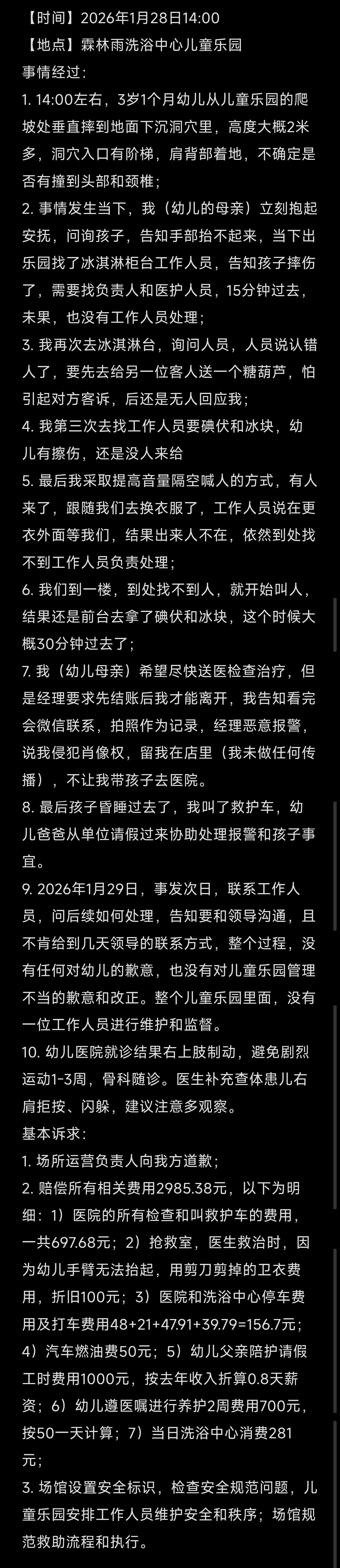 1. 14:00左右,3岁1个月幼儿从儿童乐园的爬坡处垂直摔到地面下沉洞穴里,高度大概2米多,事情发生后半小时都无人员协助解决和救助;