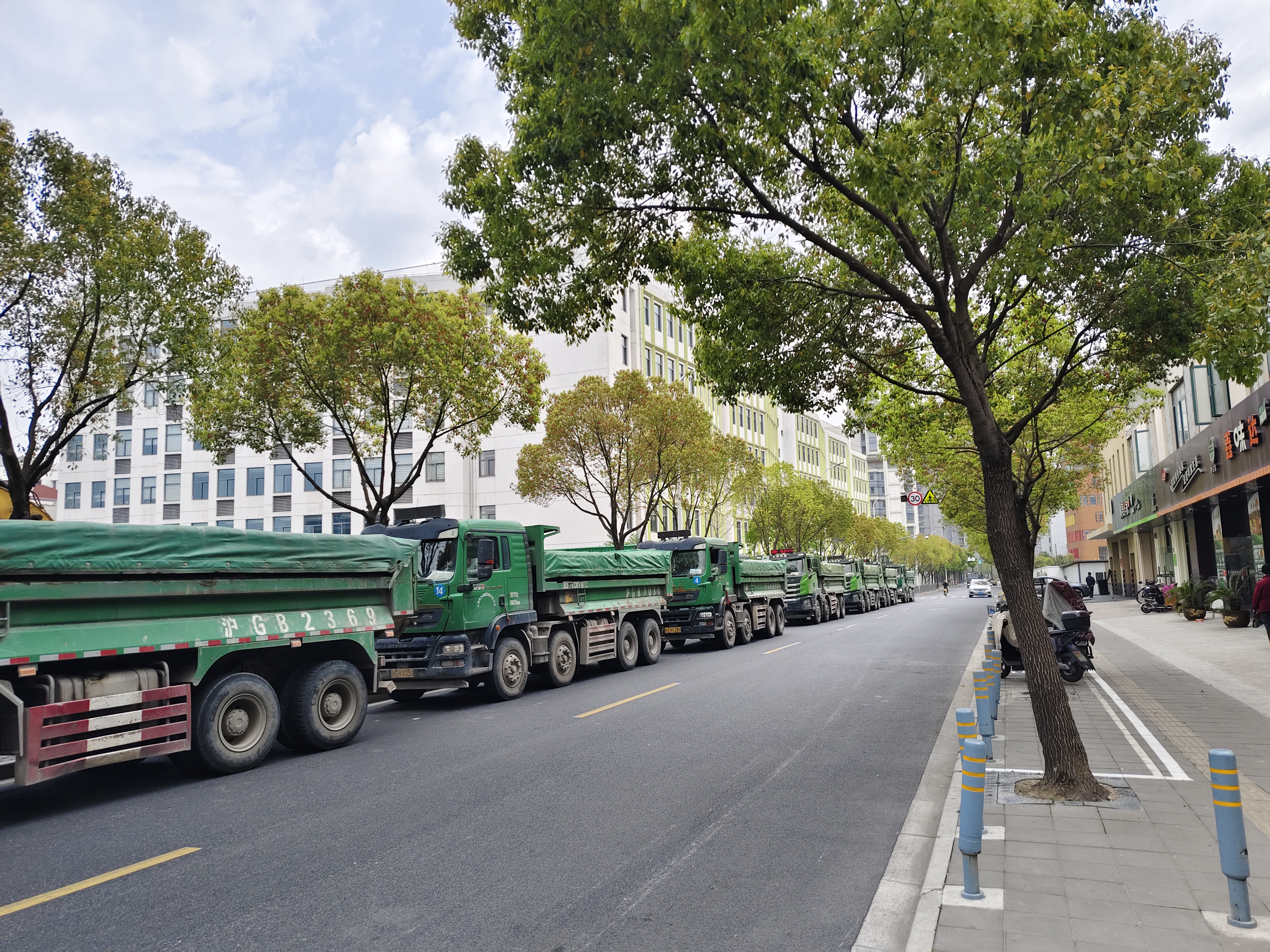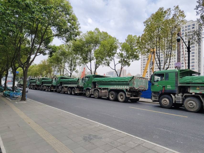 杨浦区顺平路上,内江路到爱国路段,保利江上引的大量土方车停在上海外国语附属滨江小学门口。小学生放学,家长停车,人车混杂,非常危险。