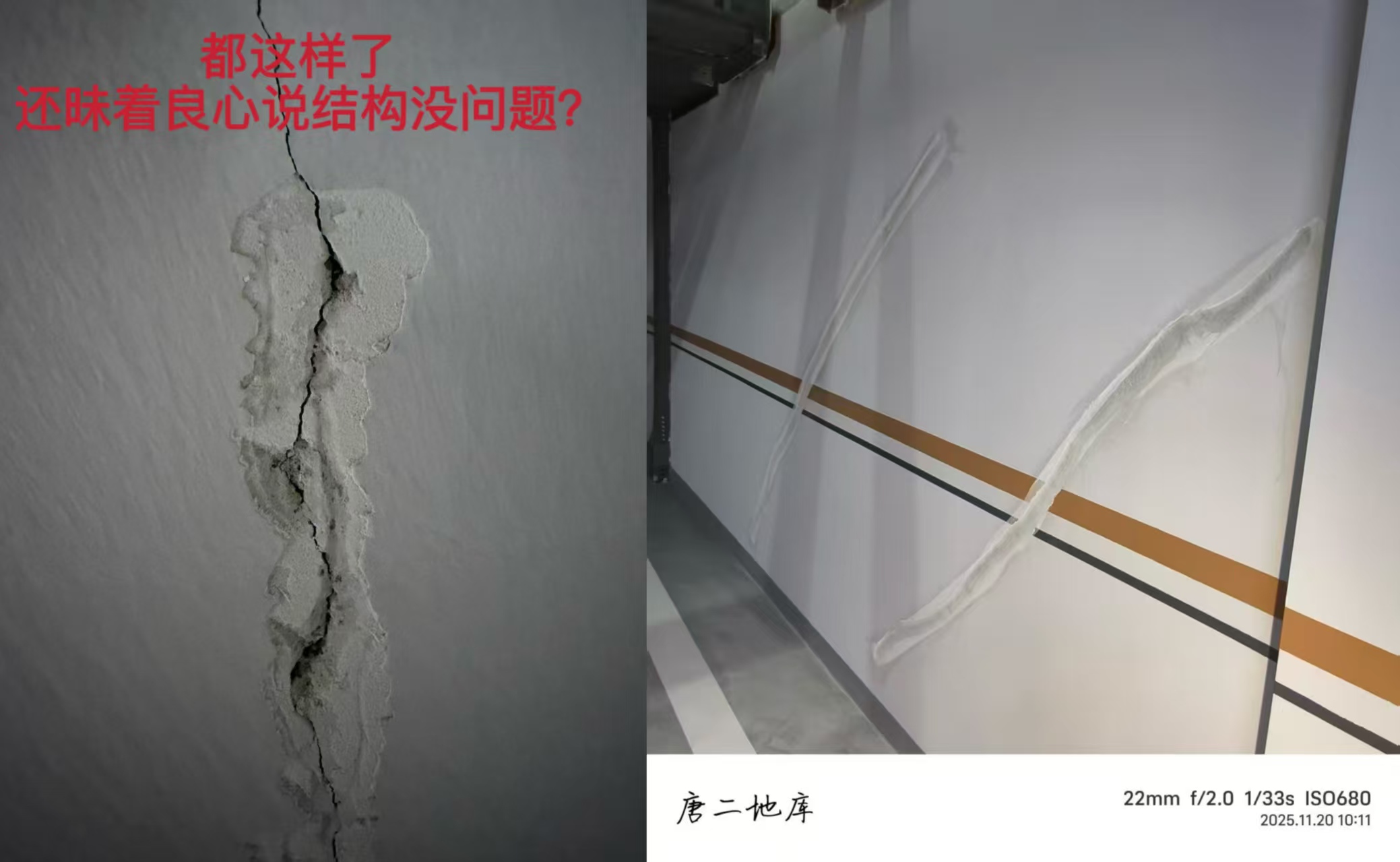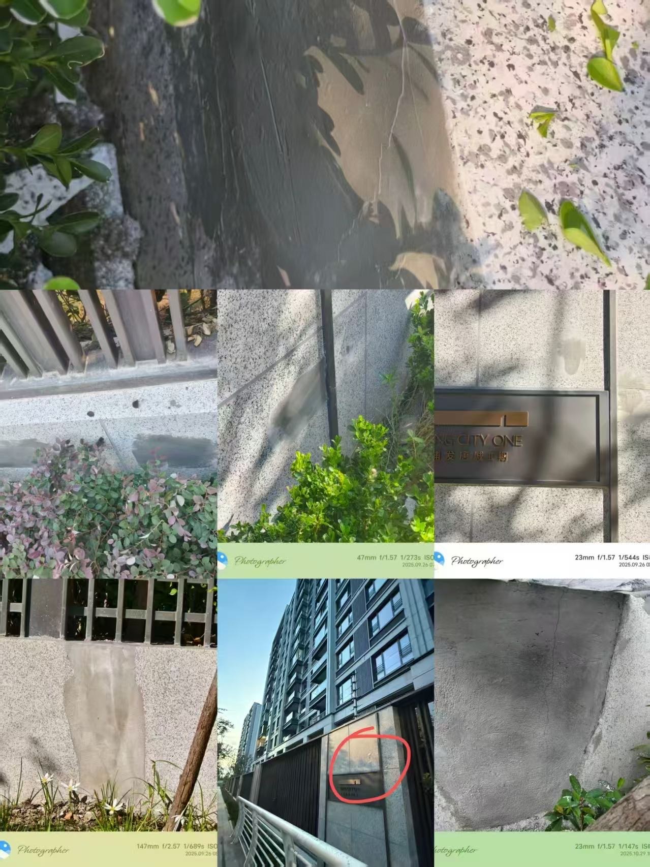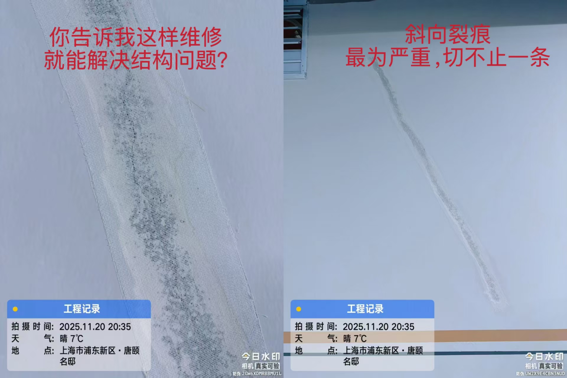 浦东新区夏榕路55弄,浦发唐城二期交房不足百日,外立面脱落,危及居民人身财产安全事件。政府相关部门虽已介入,但进展缓慢。3个月已经过去,目前只做了外立面检测,地库出现地面裂纹,墙体裂纹,要求开发商检测,开发商不予响应。且在业主不知情且给的修复方案并未通过业主同意的情况下,准备于2025年12月16日左右,强行对外立面修复,请帮助!!!
