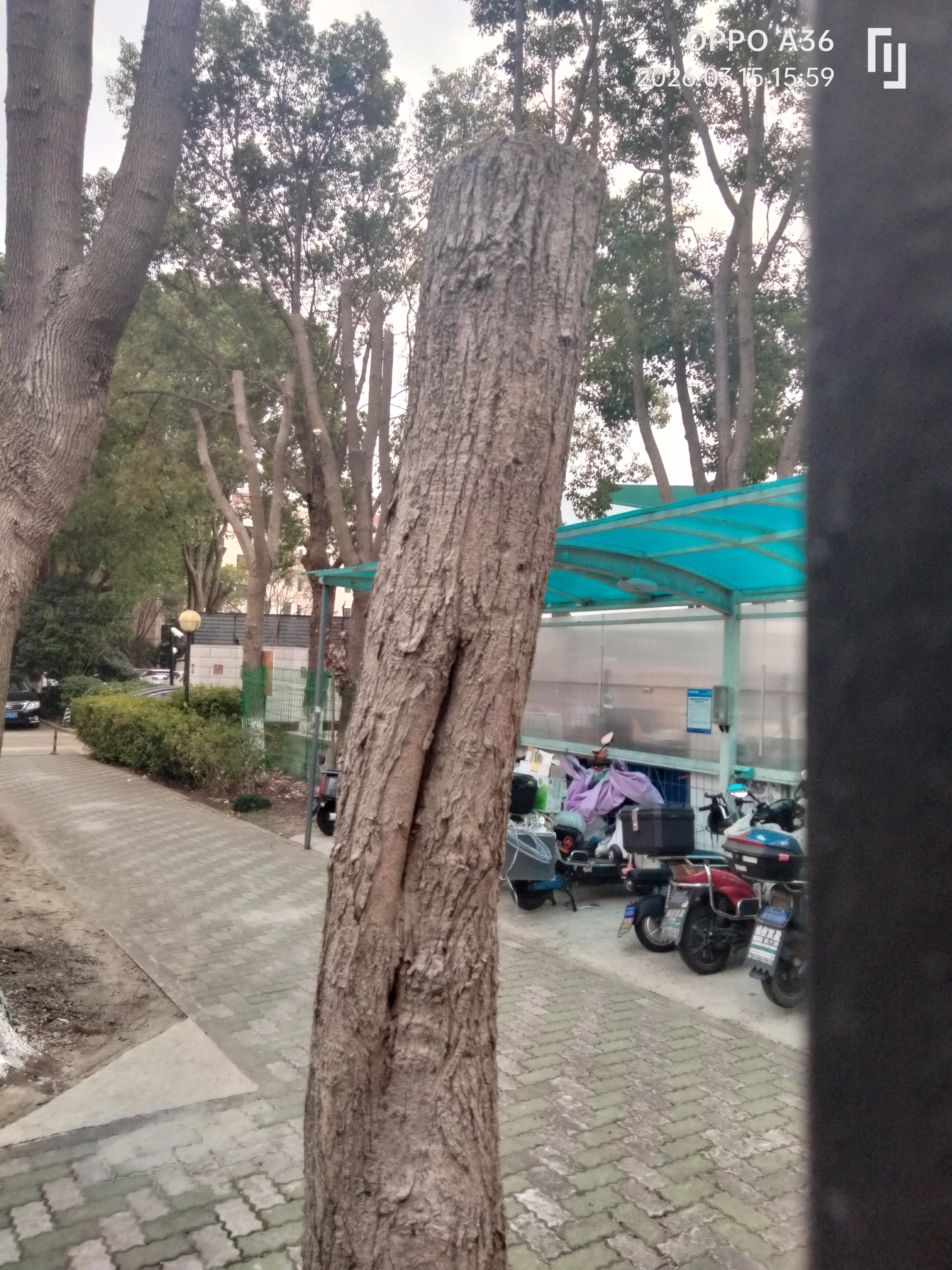 小区大量树木被过度修剪,原先枝繁叶茂的大树最后给出的说法是“枯死”,靠墙绿化被铲除,说法是为了停车。