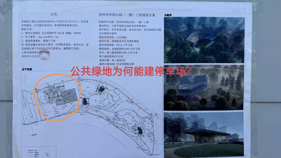 您好,我是今年购买了普陀区光复西路的新房(越秀苏河和樾府小区)的居民,新房对面是苏州河河岸公园规划用地,土地性质为“公共绿地”,然而今天在其公示在公共绿地中会建一个停车场。