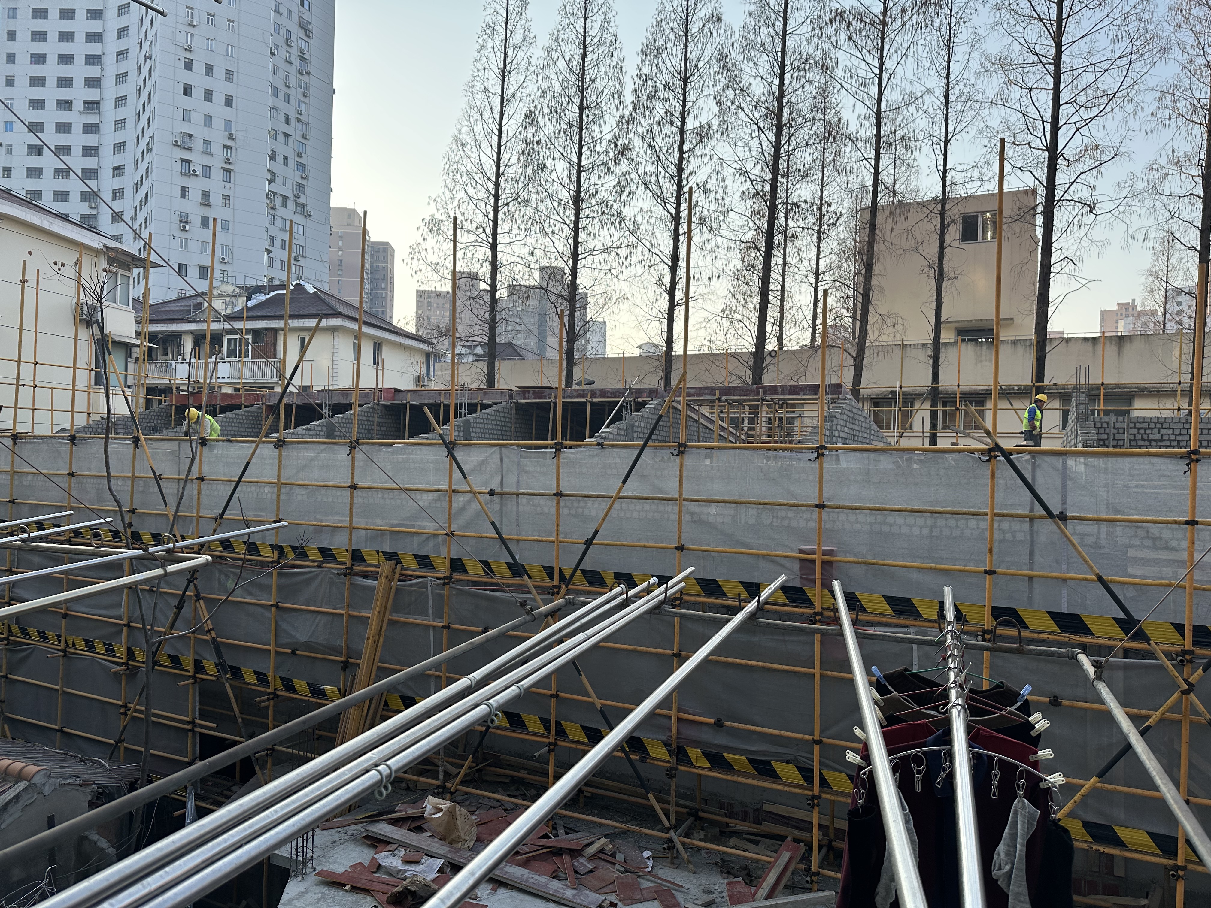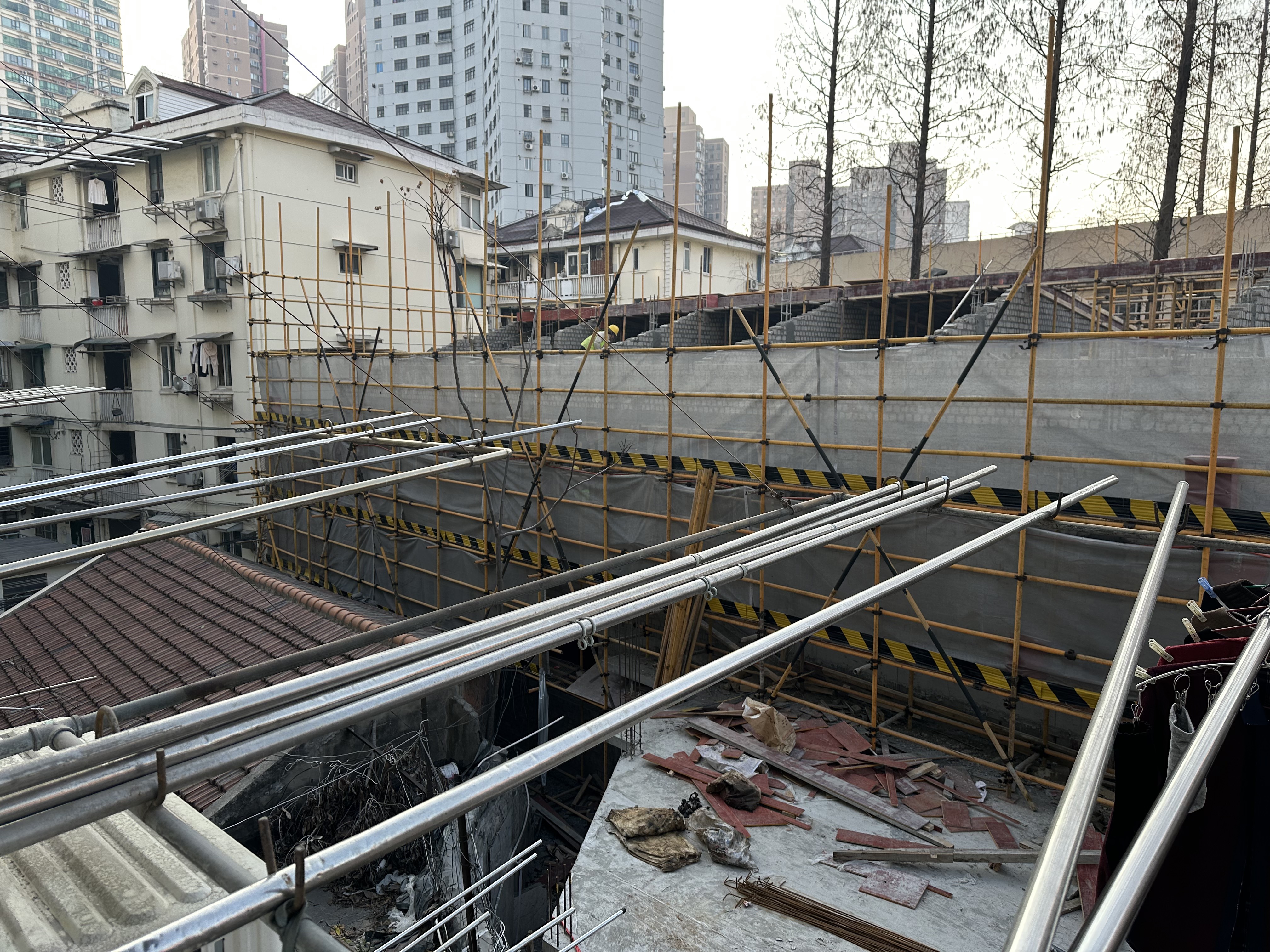 我是黄浦区徽宁路10号业主。紧挨我们楼幢前面一排原二层尖顶房(徽宁路22弄10号修缮工程),自去年下半年未见公示、及有关部门的批文,擅自将修缮工程实施为整幢楼全部拆除重建,并在原址上超长、超宽、超高、由二层尖顶房建成三层尖顶房,(还在施工中),且占用原来的公共通道,影响周围业主的原住房的采光及消防安全通道,周围业主强烈反对,並在居委会的牵头下与上海南房集团物业管理有限公司多次交涉都无果。