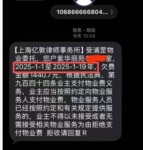 我是上海市顺平路1260弄紫华丽苑的业主,最近我们遇到一件非常荒诞的事,我们很多业主收到一条前物业公司的催款信息,由律师事务所发出来的,十几天催一千多块。这太离谱了。